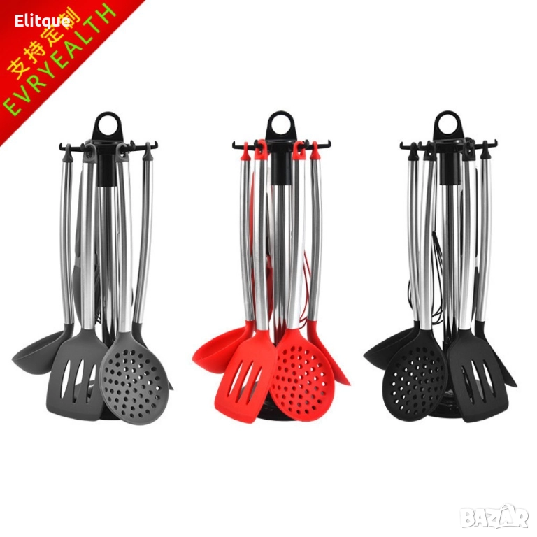 Силиконови кухненски прибори с метални. Комплект от 7 части с поставка? Освежете своята кухня с Комплекта от 7 силиконови кухненски прибори с метални дръжки и елегантна поставка! ? С този комплект ще пренесете удобство, функционалност и стил във вашата кухня. Съчетание от издръжливи метални дръжки и меки силиконови глави правят тези прибори идеални за всеки готвач.