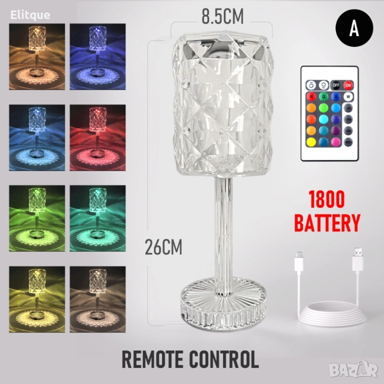 Настолна лампа с USB кабел и дистанционно тип кристална чаша. Представяме ви нашата изключителна настолна лампа с USB кабел и дистанционно управление, вдъхновена от изящната красота на кристалните чаши. Тази лампа не само осигурява функционалност във вашия дом, но и добавя магия и стил към всяка стая. Със своята кристална чаша, тази настолна лампа създава огнени отражения и сияние, което непрекъснато ви омагьосва. Тя придава на стаята ви несравнимо усещане за романтика и изтънченост. ? Удобно USB захранване: Тази лампа се захранва чрез USB кабел, което я прави много практична и удобна за използване. Можете да я свържете към компютър, лаптоп, стенен адаптер или портативно зарядно устройство, предоставяйки ви свобода да я поставите където пожелаете.
