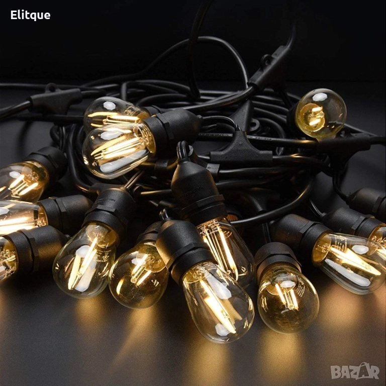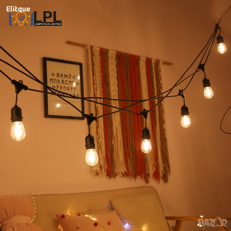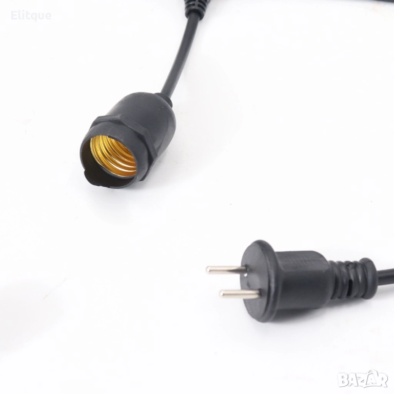 Кабел с фасунги, декоративно осветление. Подходящо за външно и вътрешно осветление. Може да се поставят стандартни или цветни крушки за още по-атрактивна атмосфера. Налични варианти: 5М с 10 фасунги и 10М с 20 фасунги