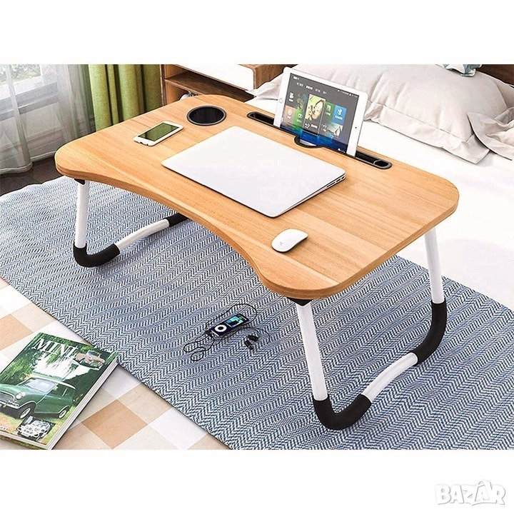 С масата можете да работите навсякъде: на легло, диван, фотьойл. Масата е оборудвана с поставка за чаша и поставка за таблет. Слотът за таблета е снабден с отвор, който ви позволява да поставите зарядно устройство