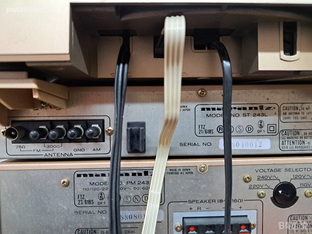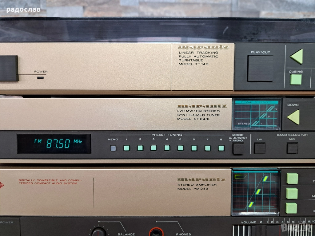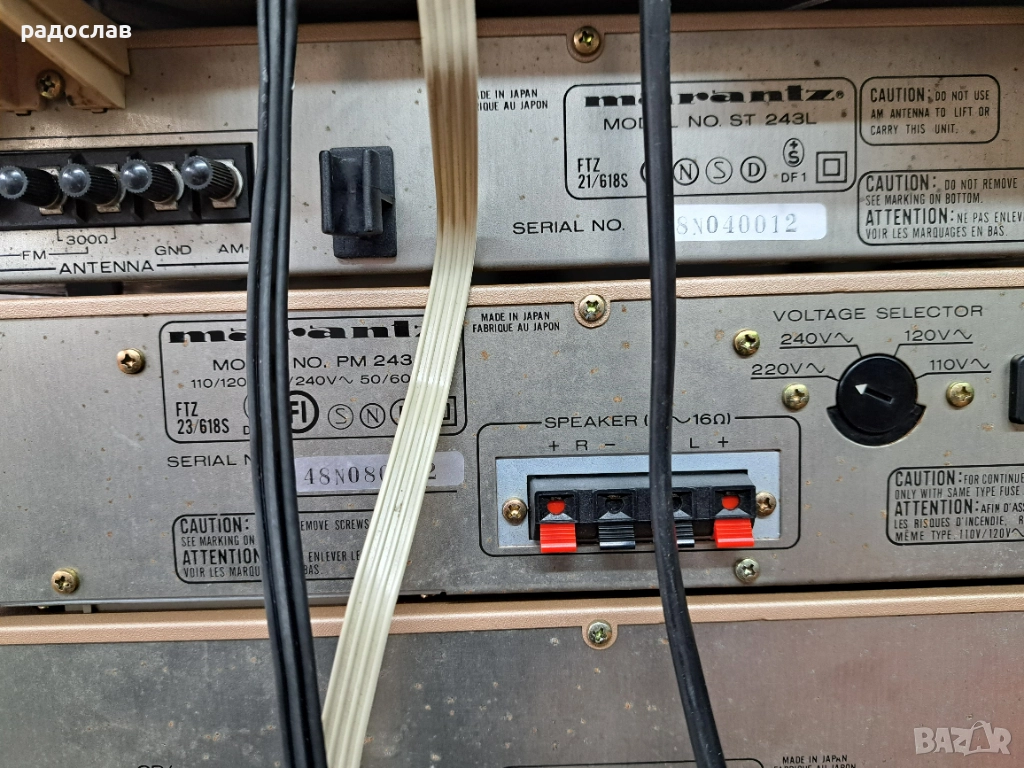 Продава се употребявана система Marantz, състояща се от четири компонента: усилвател, тунер, дек и грамофон. Технически: Усилвателят възпроизвежда и двата канала. Тунерът работи добре. Тангенциалният грамофон се нуждае от ремък. Дека също има нужда от профилактика.Свети но не плейва.