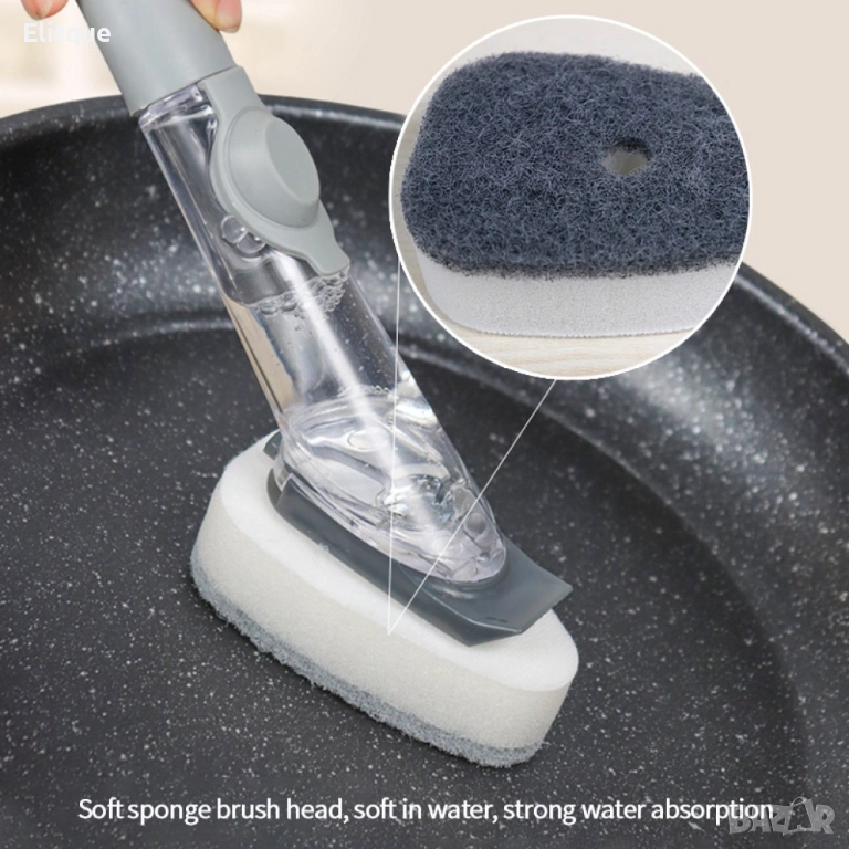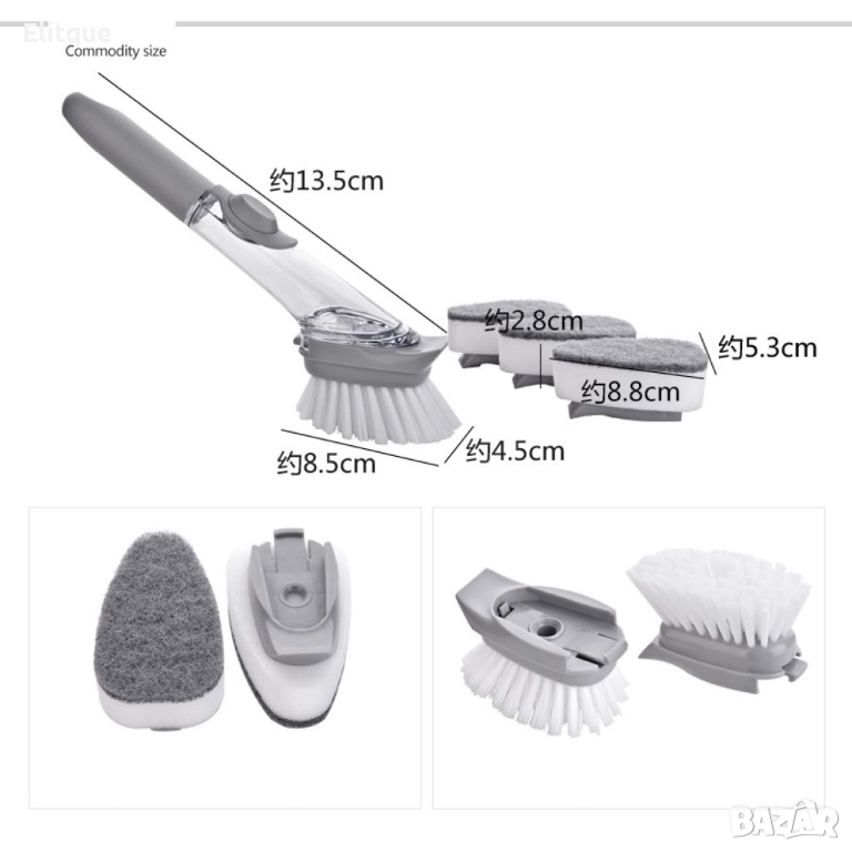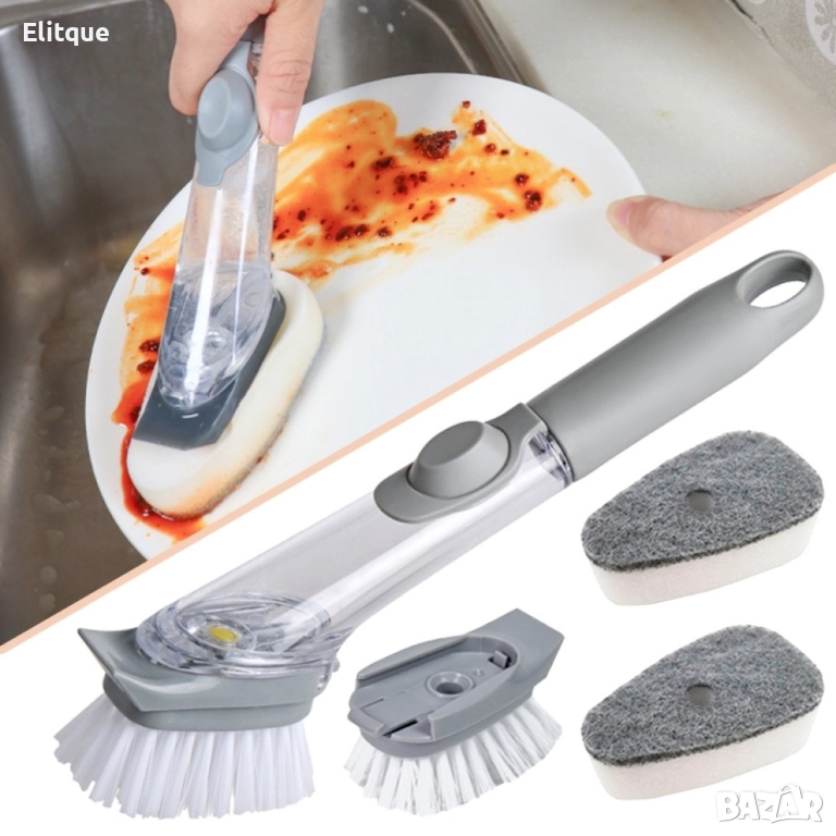 Многофункционална четка Mercaton® за миене на съдове с вграден резервоар за препарат / В комплекта ще получите: 1бр. държач; 1 бр четка; 2бр. гъби и 1 бр приставка към която се закрепят гъбите.