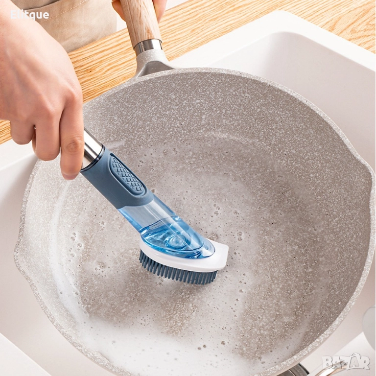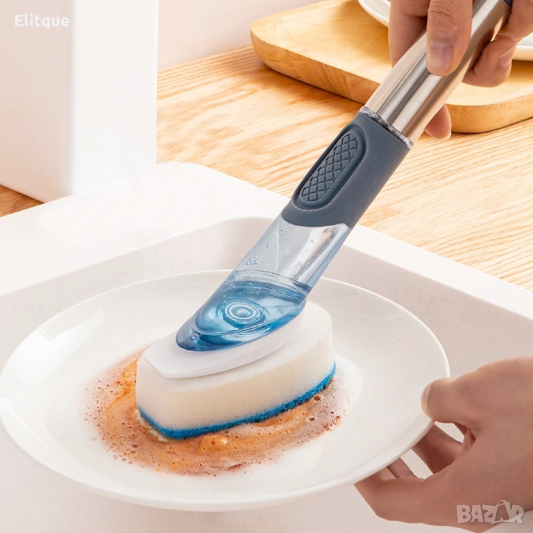 Настолен комплект от четки за миене на съдове с поставка - 4в1. Включва 4 глави - четка, силиконова четка, две меки гъби. Дръжката е с резервоар за препарат и пуш бутон за впръскване.