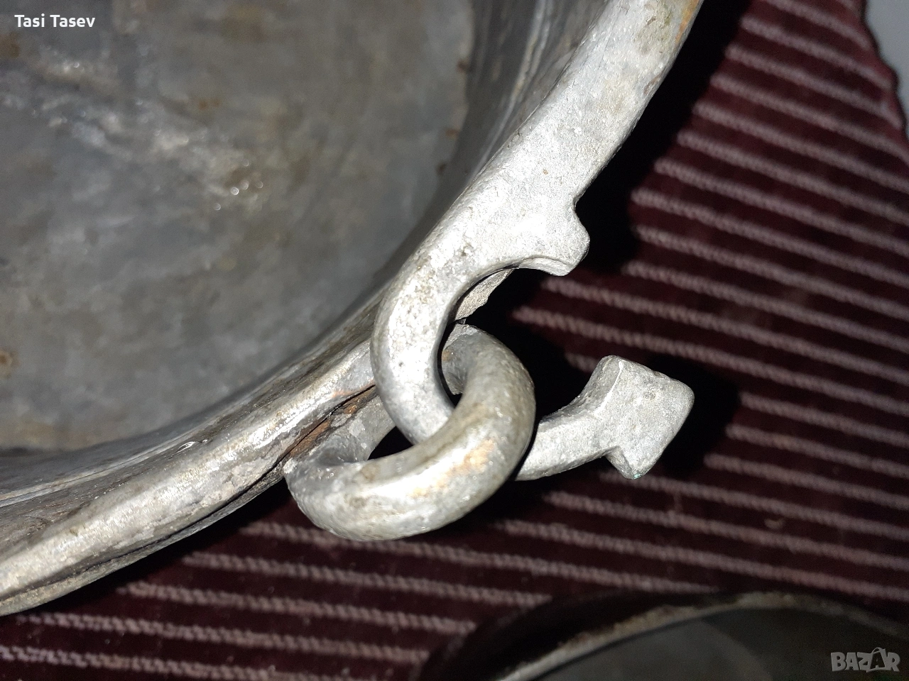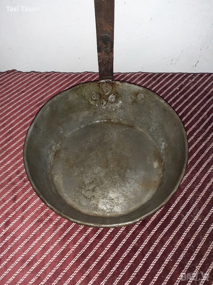 1.Стар меден (бакърен) тиган. Здрав е и е калайдисан отвътре. Диаметъра му е 24 см и дълбочината ме е 6 см. Дръжката му е от ковано желязо. Цена 20 евро.