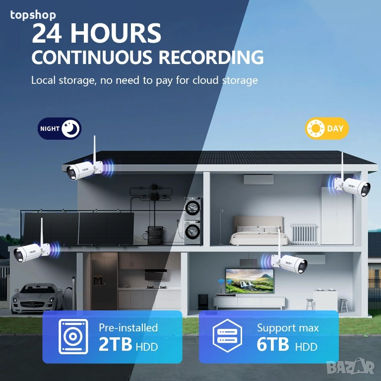 【Многозонов изглед】Можете да преглеждате всички зони за наблюдение в приложението и на екрана, без да се налага често да превключвате камерите. С предварително инсталиран 2TB твърд диск, записите ще се съхраняват автоматично във вашия NVR, вместо в облака, защитавайки вашата лична поверителност.