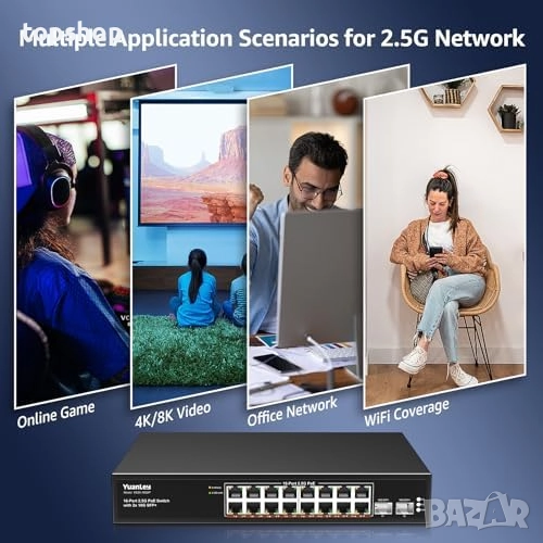 Чисто нов 2.5G 18-портов неуправляем PoE комутатор YuanLey, 16 Base-T 2.5G PoE порта, 2 x 10G SFP+..