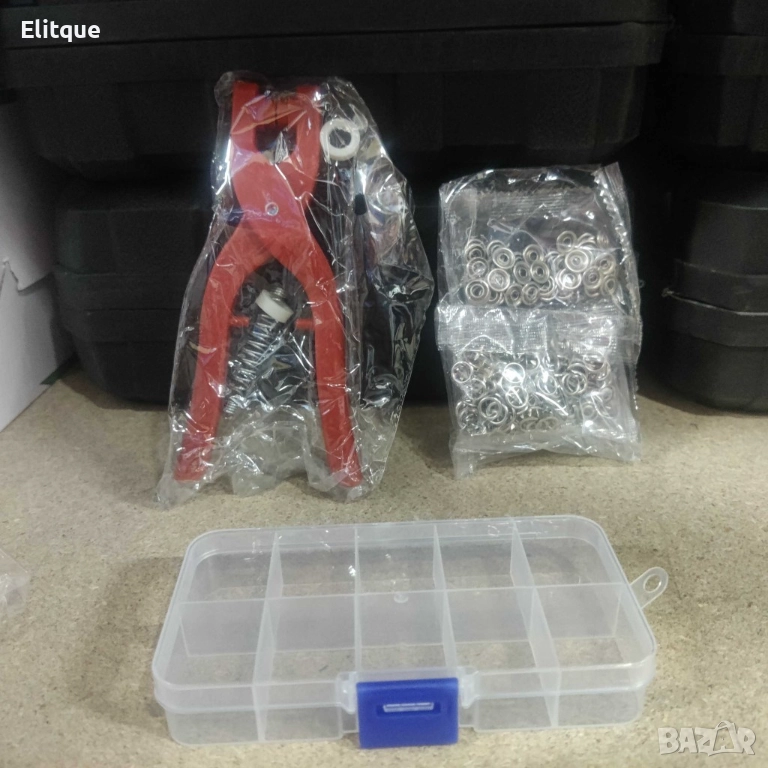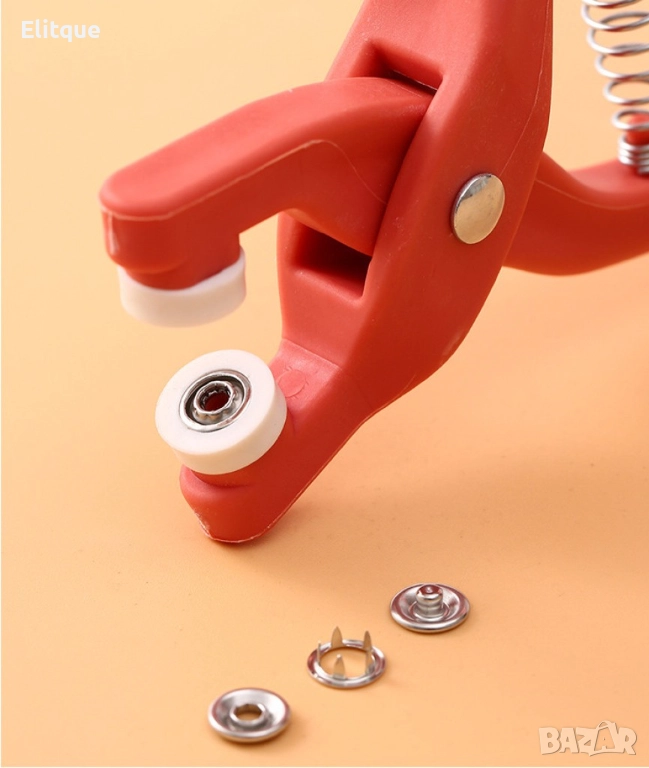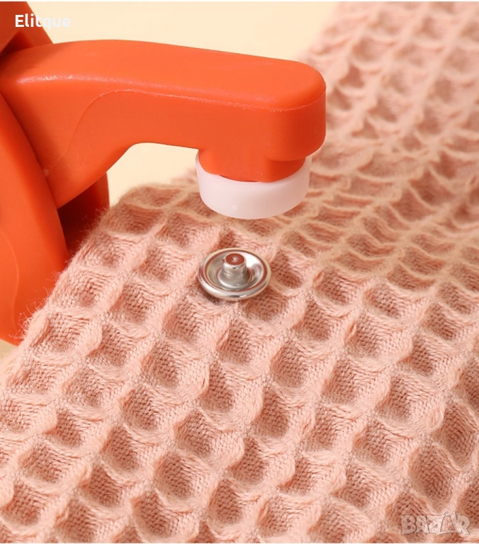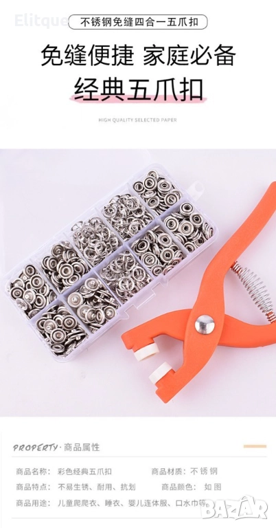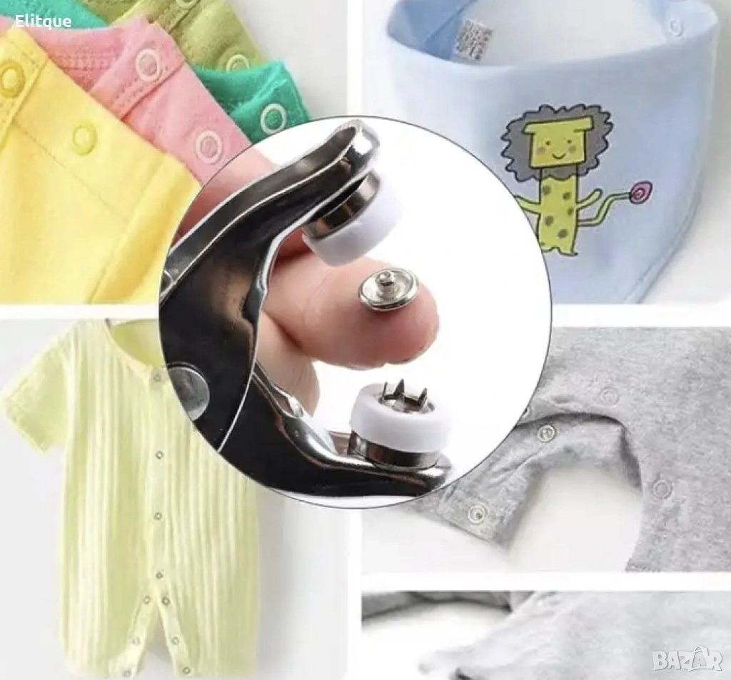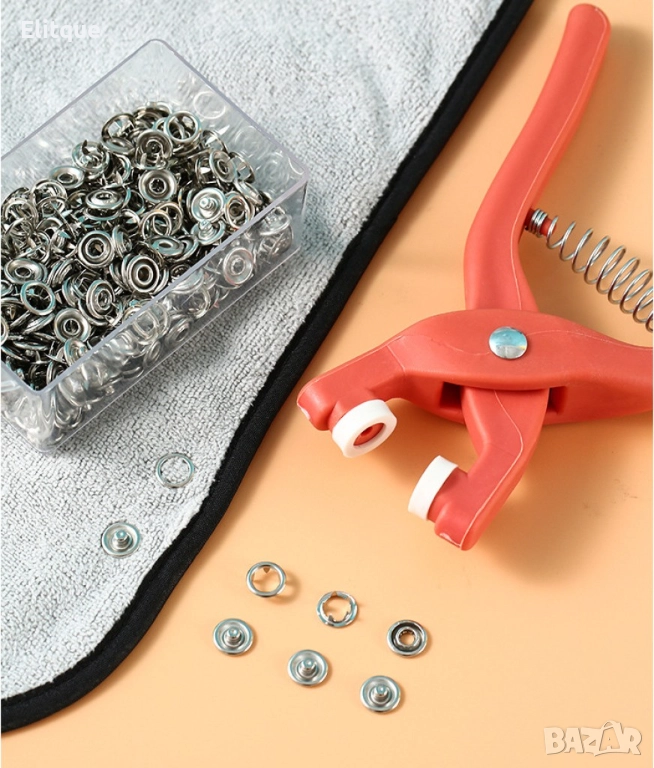 Уред за поставяне на копчета „тик-так“, капси, кутийка за съхранение на капсите / Работи върху: Различни видове платове, включително кожа, деним, вълна, памук, коприна, ликра и др. Материал: Пластмаса и метал.