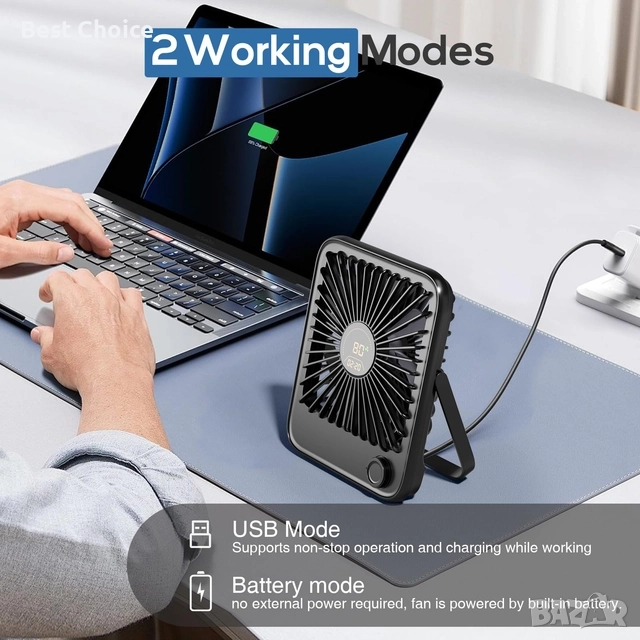 - 【Двойно захранване】Край на търсенето на батерии или на заплетените кабели. Този презареждащ се вентилатор за пътуване е с батерия от 3600 mAh и USB зареждане, което го прави изключително удобен и енергоспестяващ. Зареждайте USB настолния вентилатор чрез лаптоп, външна батерия или стенен адаптер.
