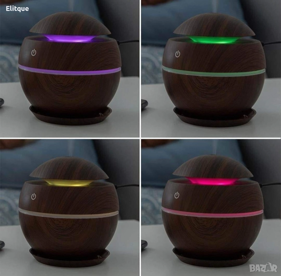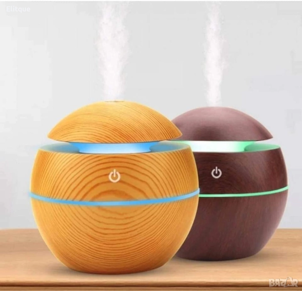 Мини дифузер за етерични масла. Вместимост - 130 мл. Бутон - On/OFF. Свръхзвуков и много тих. LED светлинки. Подобрява качеството на въздуха и ароматизира. Пулверизиране 30мл/ч. Работи с USB кабел. Размери 11 х 11 см. Цветове - бял дъб