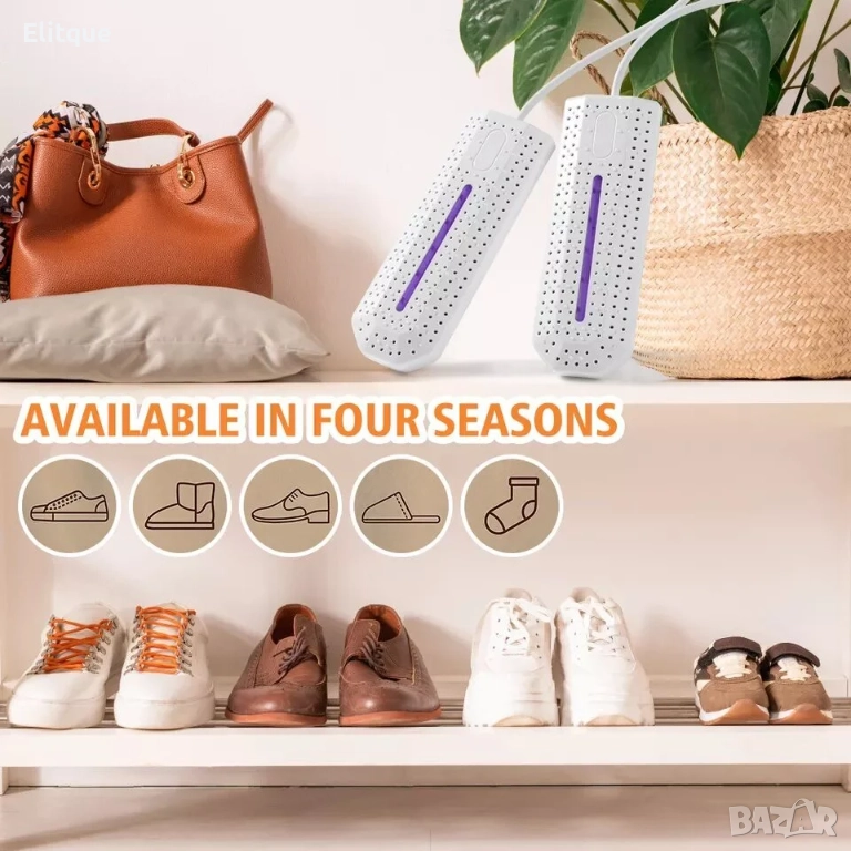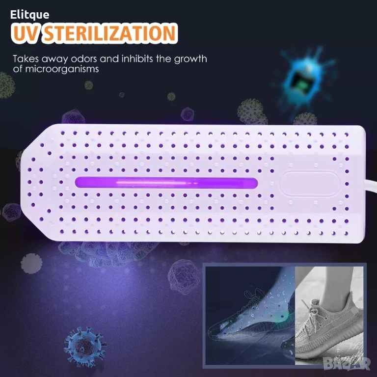 Сушилня за обувки и UV стерилизатор 2в1. Изсушава бързо, стерилизира, премахва миризми, дезодорира. Подходяща за обувки от различни материали. Мощност - 10 W. Дължина на кабел -1.1 м.