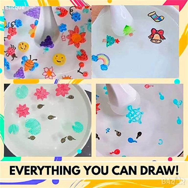 Магически фулмастери с лъжичка . Запознайте се с Магически фулмастери с лъжичка - най-вълнуващото ново изживяване, което ще ви потопи в магията! Начинът на работа с маркерите е прост. Предлагат се 8 броя маркери в опаковка. Към комплекта е включена и керамична лъжица. Какво трябва да направите, за да се покаже магията? Нарисувайте, каквото пожелаете върху лъжицата, потопете я във водата и начертаният модел ще се носи свободно във водата. Преди да започнете да рисувате се уверете, че лъжичката е напълно суха. Изчакайте 3-5 секунди преди да натопите лъжичката, за да може мастилото да изсъхне. Потапяйте я изключително бавно, за да позволите рисунката да изплува, така сякаш е жива.