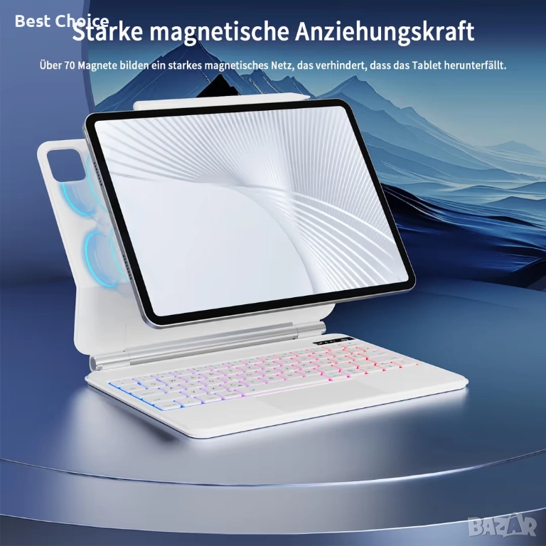 - Магнитна стойка за бързо отваряне Ултрасилните магнити свързват калъфа и таблета безпроблемно, така че можете лесно да отворите плаващата стойка под перфектния ъгъл за писане или сърфиране.