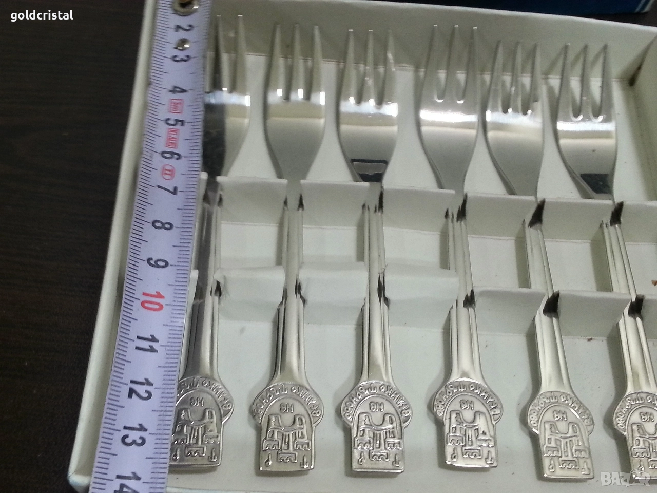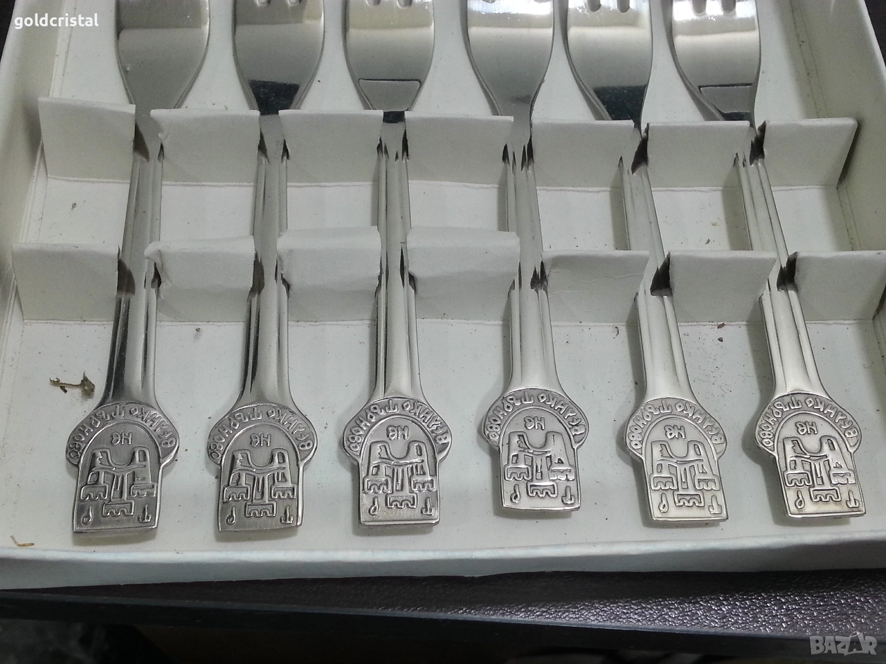 стари български вилички неръждаеми десертни велико търново неизползвани в кутия сервиз комплект сет лот ретро арт декор винтидж колекция стари старинни антикварни предмети обзавеждане за дома и семейството подходящи за подарък за ценители и колекционери