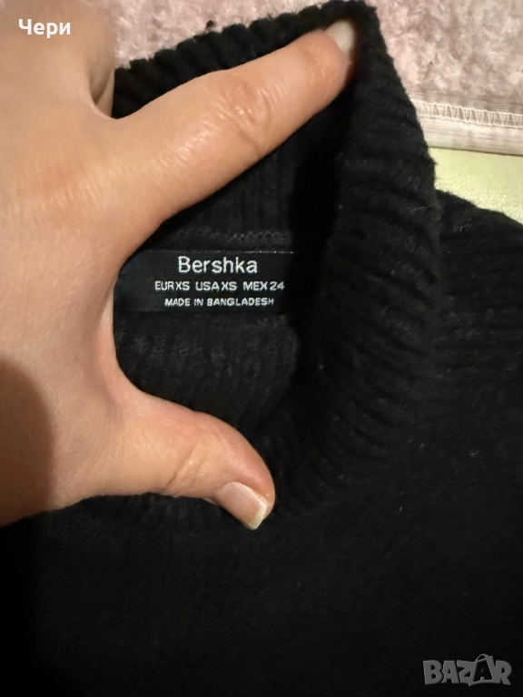 Дамски черен мек зимен пуловер на Bershka, размер XS/S. Носен е броени пъти, без забележки.