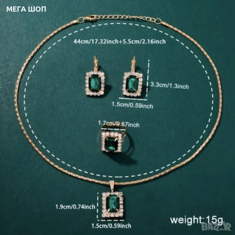 Елегантен комплект часовник и бижута с зелени кристали и златист корпус → Обява 52907834