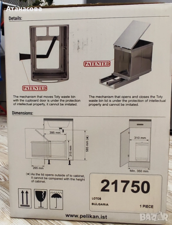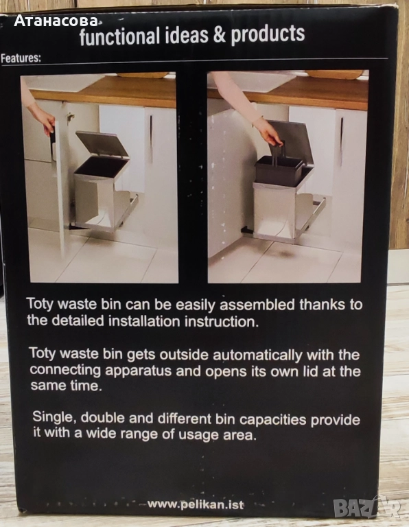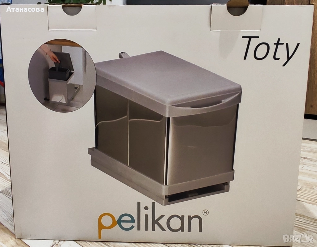 Кошчетата за вграждане с автоматично отваряне Pelikan от серия Toty се монтират много лесно благодарение на включения в комплекта шаблон за позициониране и отмятане на местата за закрепване вътре в шкафа и на вратата. Кошчето Toty автоматично излиза навън и се отваря заедно с отварянето на вратата на шкафа, в който е монтирано. Механизмът, който издърпва кошчето и отваря капака е патентован от Pelikan и може да работи еднакво добре на врати с ляво и дясно отваряне.