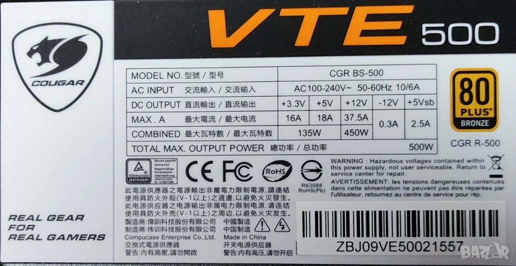 Захранване - Cougar 500W Bronze 80plus,