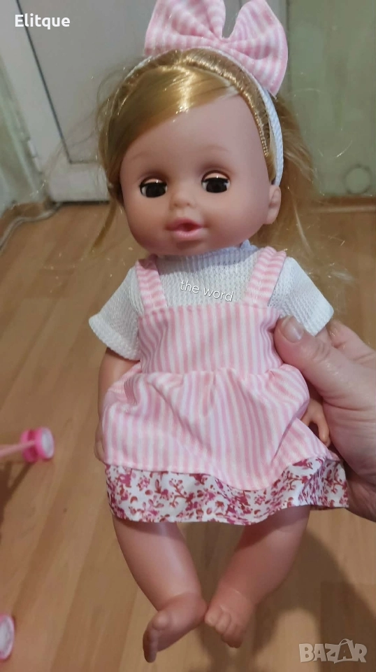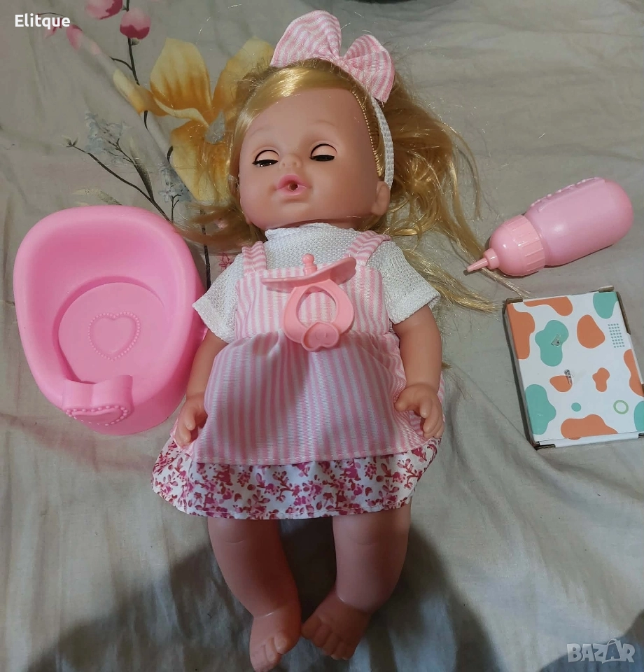 33 см реалистична кукла – удобна за малки ръчички и подходяща за гушкане. 12 звука и думи на български – куклата се смее, плаче, казва „мамо“ и други. Интерактивна игра – пие от шишето и може да пишка, за да имитира истинско бебе. Подходяща за деца над 3 години – безопасна и лесна за игра. Материал: винил и текстил; Препоръчителна възраст: 3+ години; Предлага се в три варианта: Бебе в бяла рокличка – нежна и сладка визия. Бебе в розова рокля – игриво и кокетно. Бебе в гащеризон – удобно и модерно облекло.