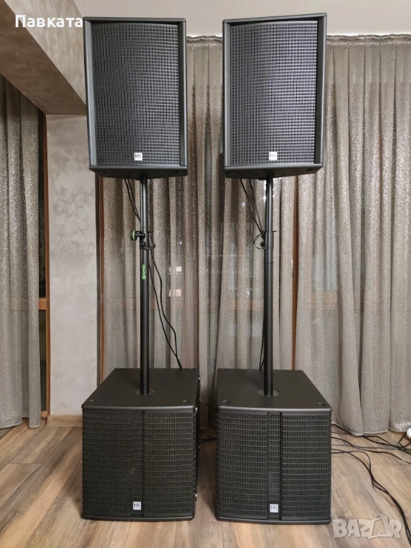 Мощност: 1200 W пикова (Class D bi‑amp)