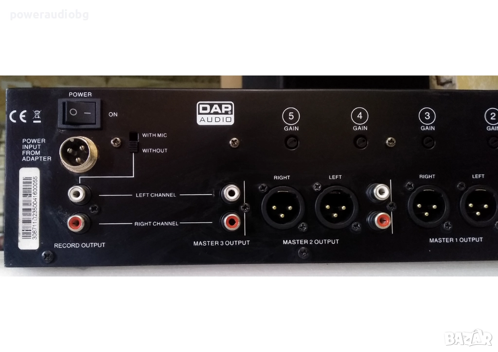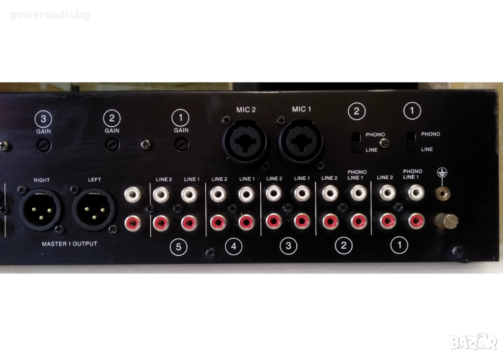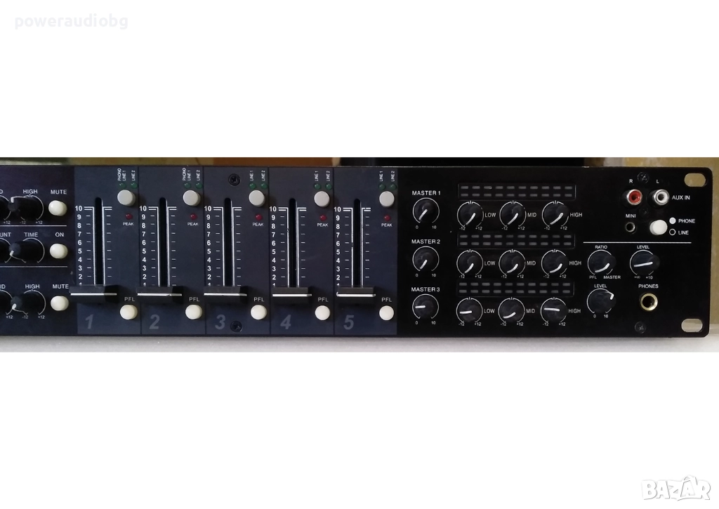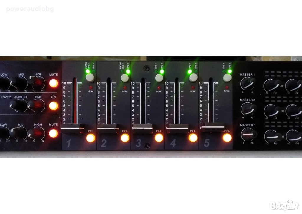 5x линейни входа с индивидуален контрол на силата на звука (фейдъри) и усилването
