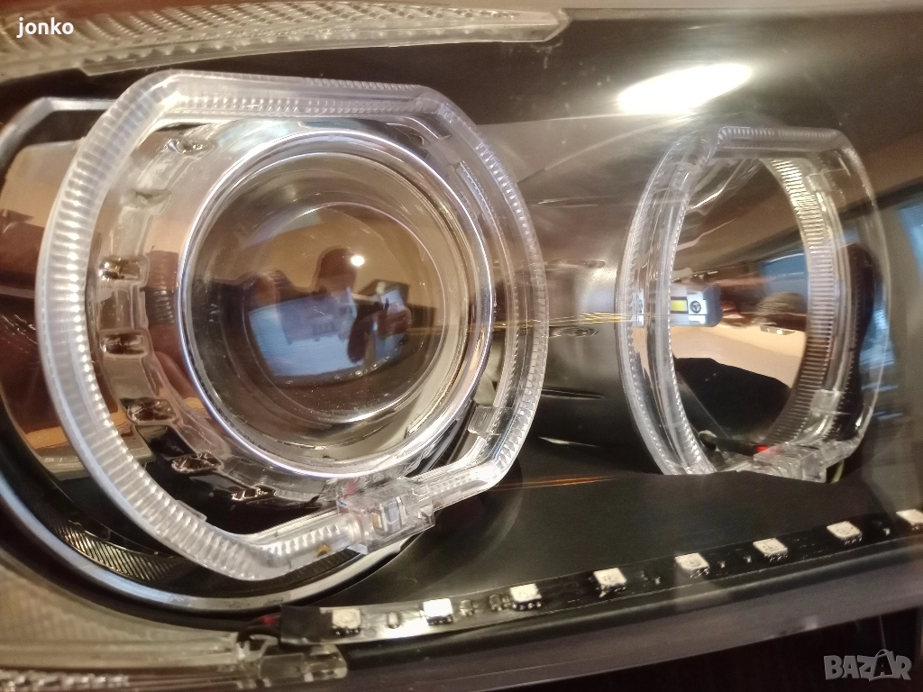 монтирани BI-LED проекторни лещи 2,5 инча/с къси и дълги светлини/, LED ангелски очи , като едното е комбинирано с жълта светлина за мигач, синя просветка, стъкла с керамично покритие.