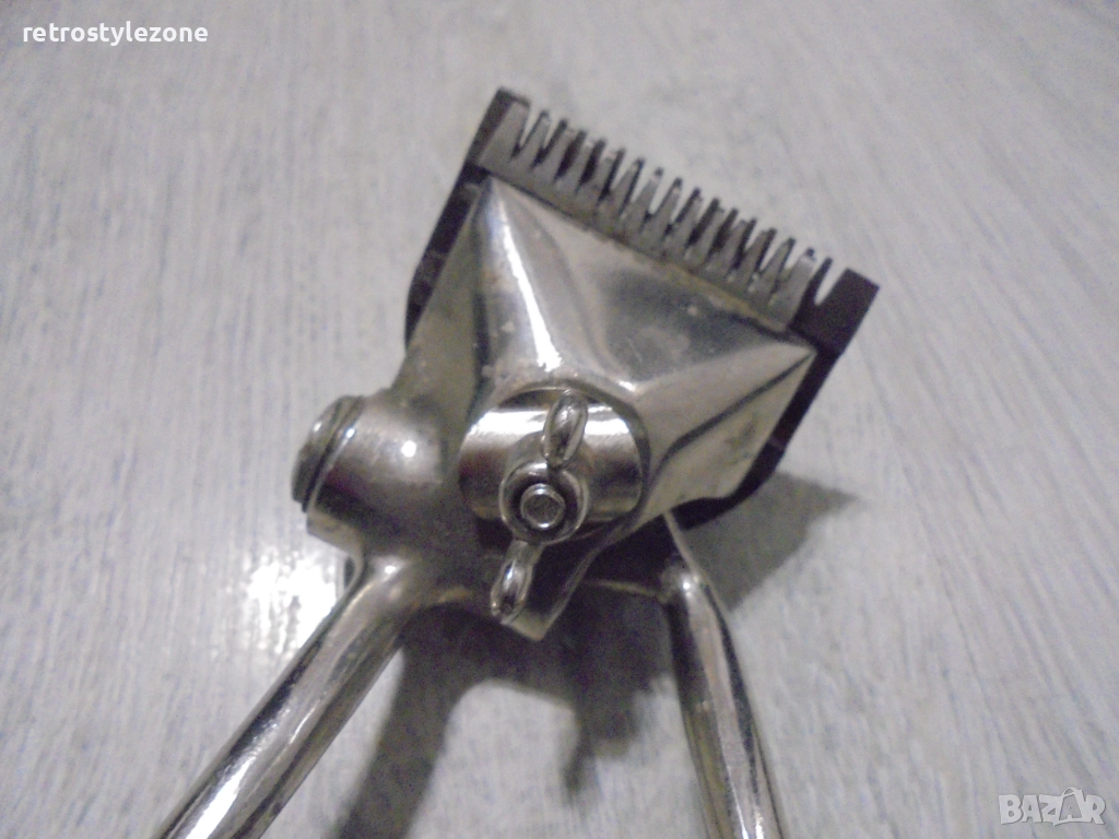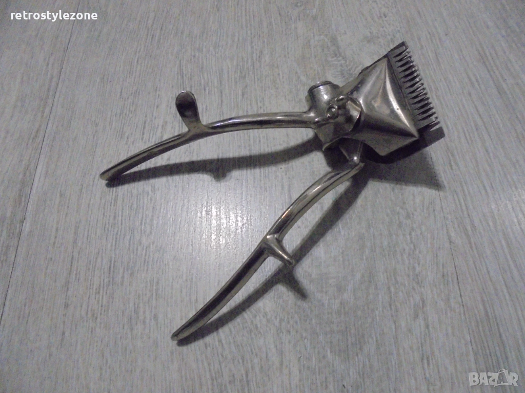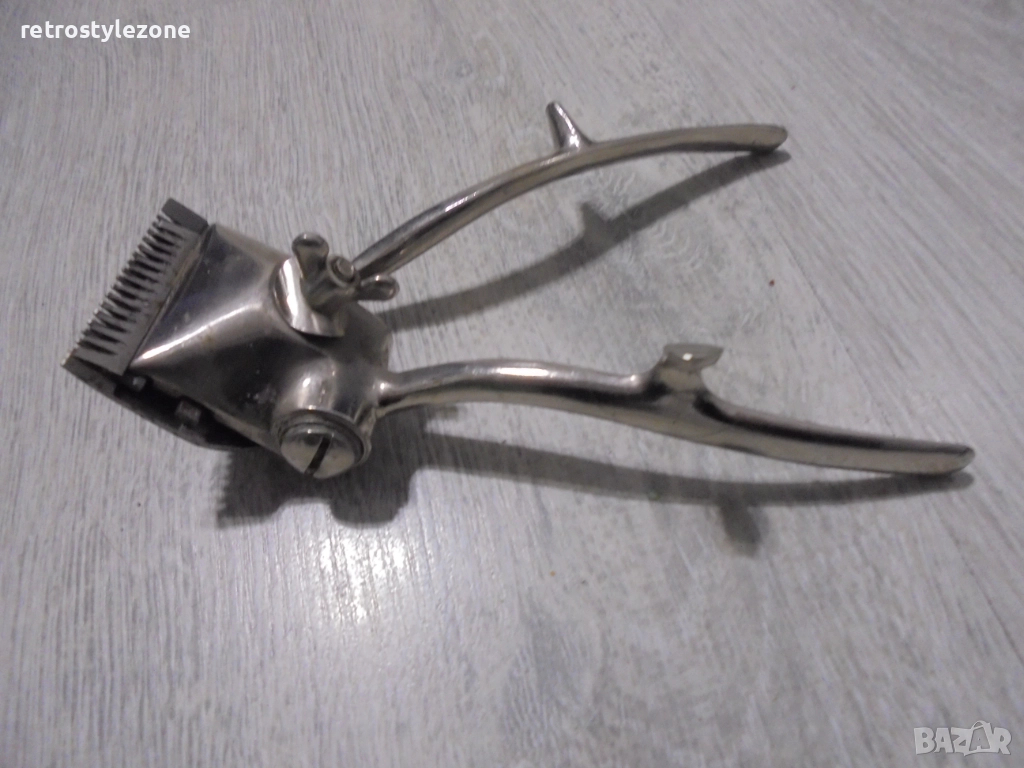 Автентична, оригинална, ръчна, механична, машинка за подстригване, използвана от бръснари в периода преди електрическите машинки да станат широко разпространени. Изработена е от устойчив метал, с ръчно задвижване чрез натиск върху двете дръжки.