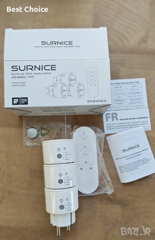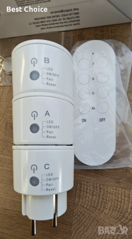 Комплектът включва 3 контакта и 1 дистанционно управление.