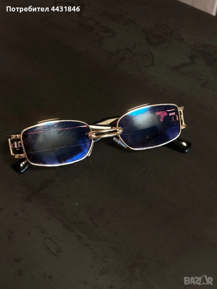 Стилни винтидж слънчеви очила със златиста метална рамка и правоъгълни стъкла с леко огледален синьо-лилав оттенък. Елегантен и модерен дизайн, който придава луксозна визия и се откроява с фин детайл и изчистени линии. Подходящи както за ежедневен аутфит, така и за по-специални поводи. Има лека забележка на стъклата, както се вижда и на снимките.