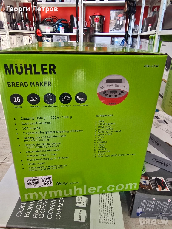 Машината за хляб предлага 15 програми – основна, френски хляб, пълнозърнест, сладък, млечно-маслен хляб, безглутенов, бърза, кекс, бъркане, замесване на тесто, тесто за паста, йогурт, мармалад, печене, домашен хляб ( ръчна настройка) и се управлява чрез LCD дисплей. Корпусът е топлоизолиран. Можете да избирате колко изпечен да е хляба и с каква коричка да бъде. През прозорчето за наблюдение можете да следите процеса на приготвяне. Автоматично поддържа топъл хляб до 1 час. Звуковата сигнализация подсеща за точния момент, в който да сложите допълнителните съставки като семна, маслини или ядки. MUHLER - MBM-150 идва с 2 бъркалки за по-голяма ефективност на месенето, кука за сваляне на бъркалката, мерителна чашка и мерителна лъжичка.