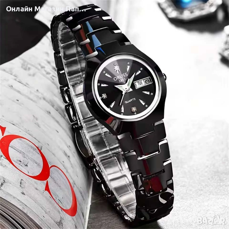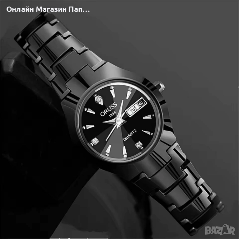 Моделът работи с надежден кварцов механизъм и разполага с двоен календар (дата) за допълнително удобство при ежедневно носене. Черната метална верижка е лека и комфортна, завършена със закопчалка тип гривна.