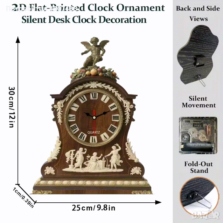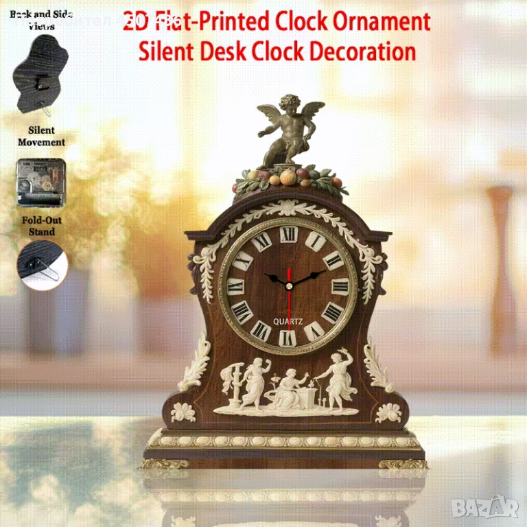 ангелски дървен часовник за маса, циферблат с римски цифри - безшумен, с