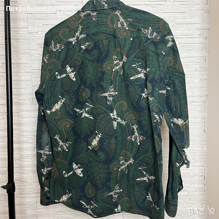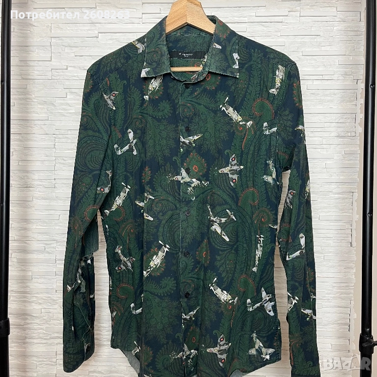 Givenchy зелена памучна риза с копчета отпред и принт на самолет, отговаря на размер М. Десният ръкав на ризата е скъсан под лакътя и може да се преправи спокойно на риза с къс ръкав.