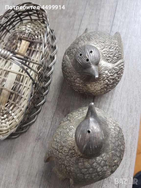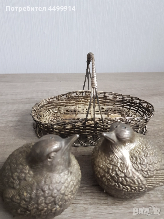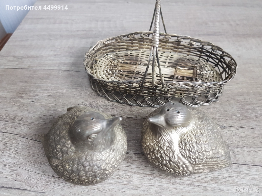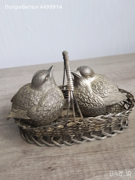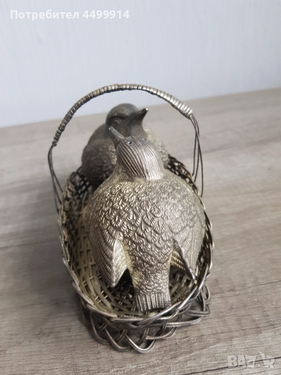 Прекрасен винтидж комплект солница и пиперница със сребърно покритие във формата на 2 птички, сгушени в метална кошница за носене. Без следи от производителя.