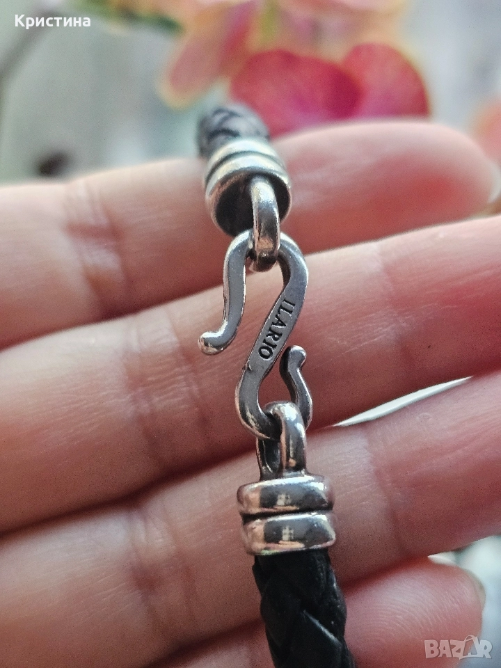Италианска маркова гривна от естествена кожа и сребро/925. Маркировка на винтидж дизайнера ILario, 925 и печата на Италия. Дължина: 19 см., но е подходяща, ако носите гривни 16, 17, 18 см. Тегло: 18.8 гр.