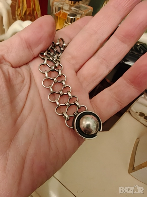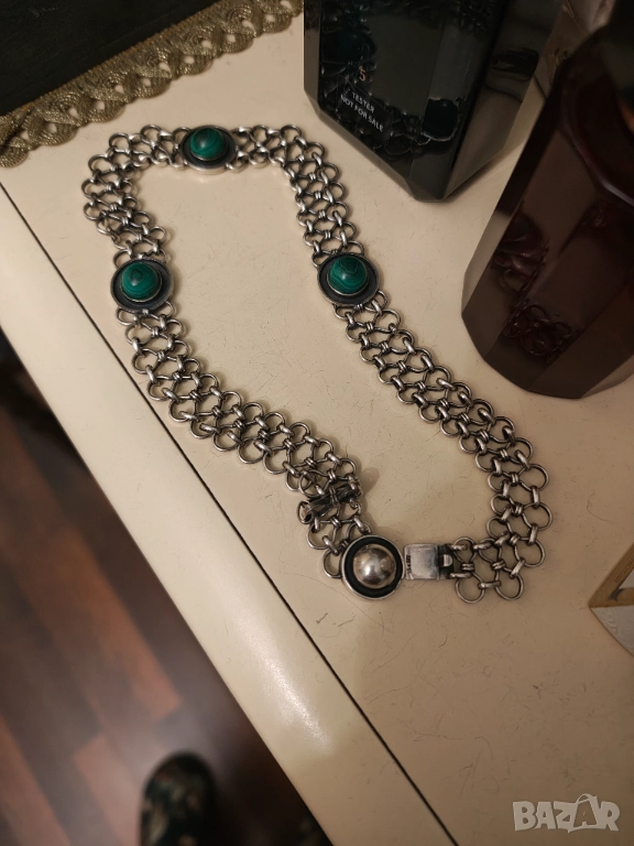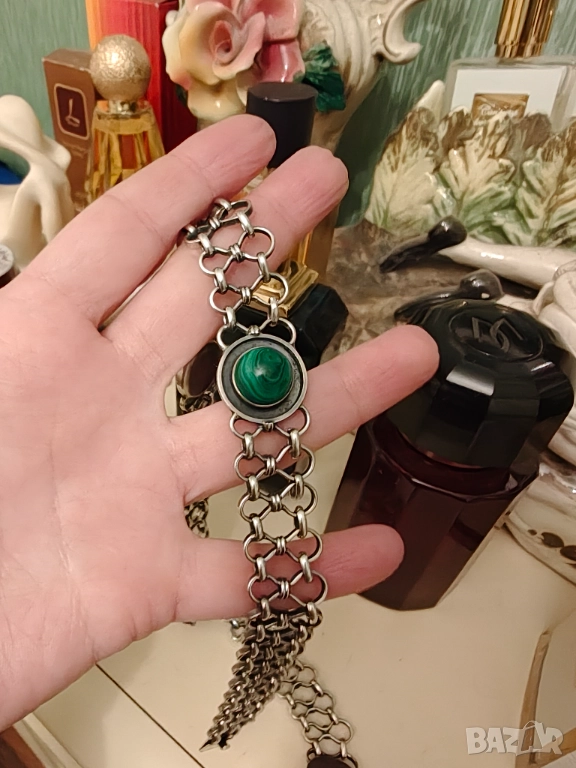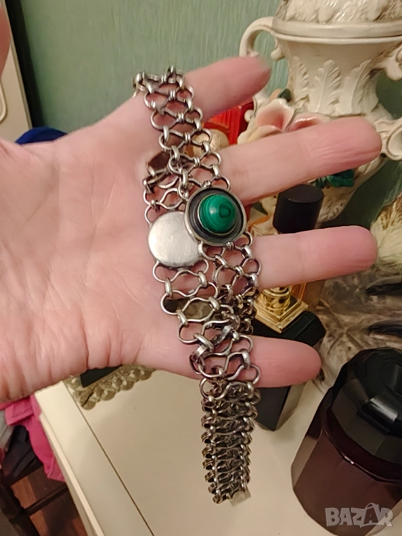 Френска изцяло ръчна изработка масивни сребро 835 натурален малахит .Дължина 44 см Ширина 1,9 см Здрава масивна плетка и закопчалка .В перфектно състояние ,маркирана Към нея има и същата гривна в профила ми .Продажба с благотворителна цел .Крайна цена