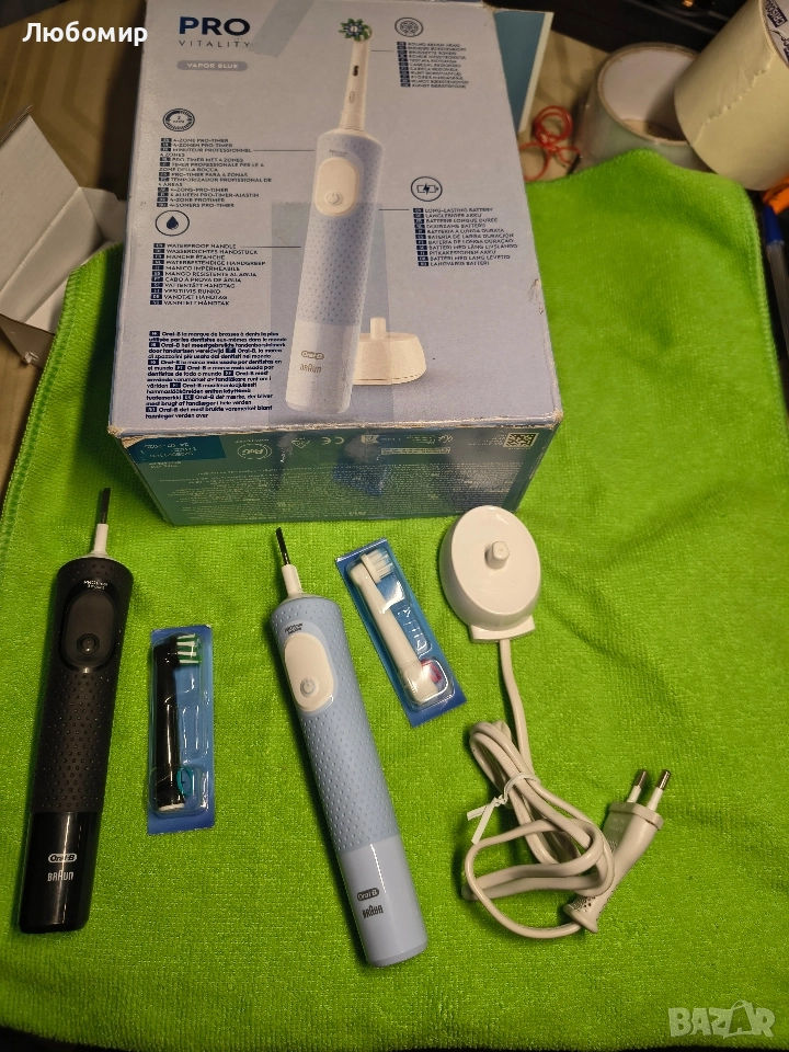 използвана черната не работи с две нови глави е синята.Електрическа четка за зъби Oral-B Vitality Pro/Електрическа четка за зъби, Двоен пакет, 3 режима на почистване за грижа за зъбите, Дизайн от Кафява, Синя/Черна