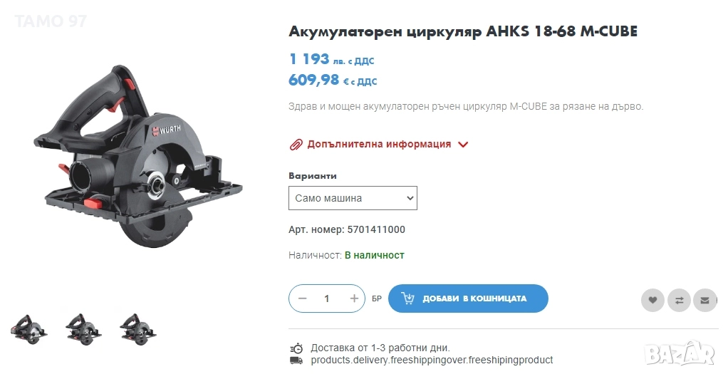 Продавам акумулаторен безчетков циркуляр на Вюрт от новата M-Cube серия. Машината е като нова все още, както се вижда на снимките, използвана е броени пъти и работи брилянтно, производство от 2024г. внос от Франция. Обявената цена е за само циркуляра. При желание на клиента може да се окомплектова с 2 батерии по 18V 5.0Ah с индикатор и бързо зарядно с охлаждане и цената ще е 415евро. Пращаме с преглед и тест с куриерска фирма еконт може и лично предаване за гр. Шумен.