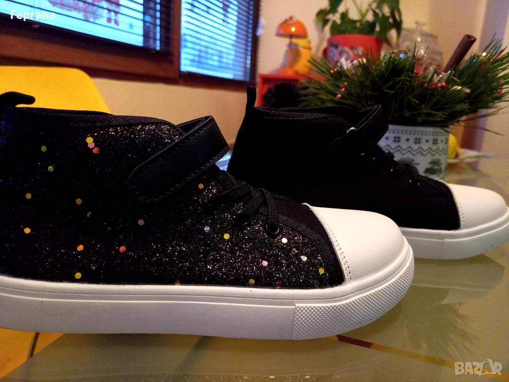 Нови високи платнени маратонки с брокат. Размер 34,5, дължина на стелката 22,3см.