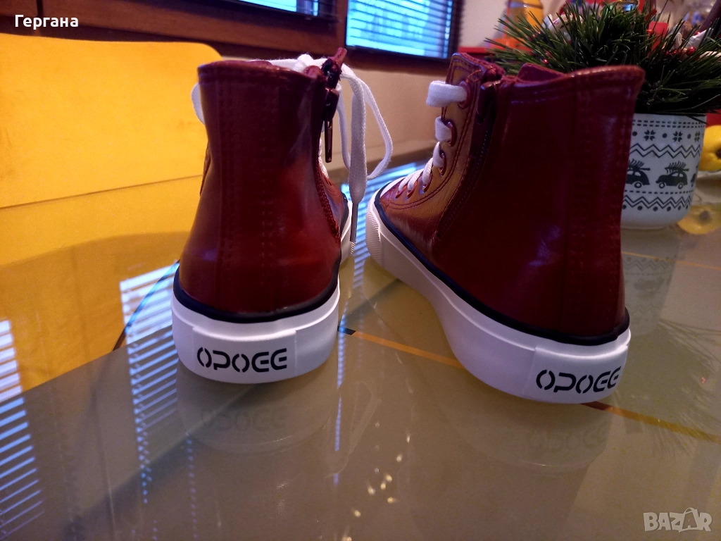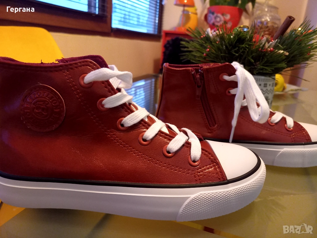 Нови високи кецове с връзки и страничен цип. Винено червени, размер 34, дължина на стелката 21см.