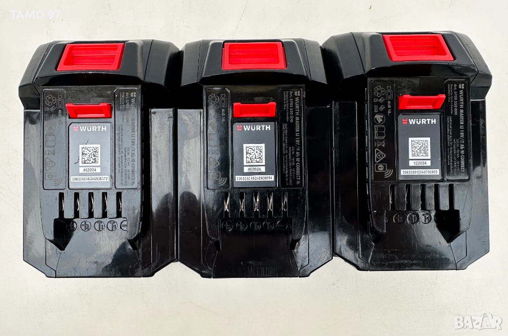 Продавам 3 броя акумулаторни батерии на Вюрт 18V 5.0Ah с индикатор от последното поколение M-CUBE серия с Wi-fi управление, производство от 2024г. внос от Франция. Имам налични 3 броя, обявената цена е за една батерия, може пакетна цена за 3 броя 185евро. Пращаме с опция преглед и тест с куриерска фирма еконт може и лично предаване за гр. Шумен.