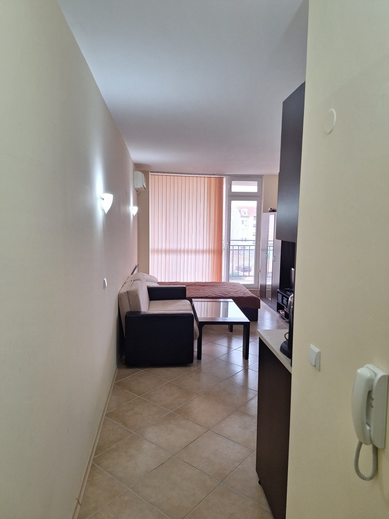 ЦЕНТЪРА НА СЛЪНЧЕВ БРЯГ!!!Прeдлагаме за продажба обзаведено просторно студио в комплекс, разположен в централната част на Слънчев бряг. Местоположението е много удобно - на пешеходно разстояние може да ползвате всички необходими комуникации, а до пясъчната ивица се стига за около 5 мин пеша. Студиото е просторно и светло, състои се от антре, голямо помещение с дневна зона, кухненски бокс и спален кът, баня с тоалетна и балкон с гледка към басейна. Апартаментът се намира на четвъртият етаж. Продава се с мебели, оборудван и монтиран климатик. На метри от комплекса се намира целогодишно работещ супермаркет. Комплексът предлага удобства и услуги, подходящи за провеждане на пълноценна почивка, като осигурява и комфорта на целогодишното ползване на имота. На разположение на живущите и техните гости на разположение са: Открити басейни; Джакузи; Бар при басейна; Кафене и снек-бар; 24-часова охрана Услуги - пране и хим. чистене; Хидравлични асансьори; Поддръжка на комплекса; Автомобили под наем; Туристически услуги; Трансфер до летище; Годишната такса за обслужване е 300 евро.