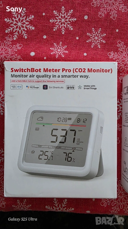 Термометър и хигрометър SwitchBot Meter Pro Устройството измерва нивата на CO2 (537 ppm), температурата (25.1°C) и влажността (76%).