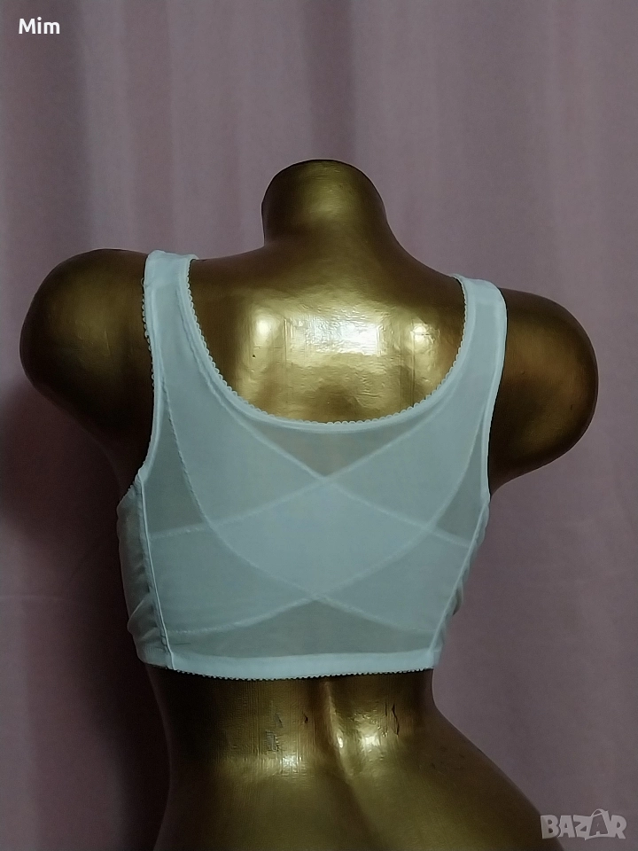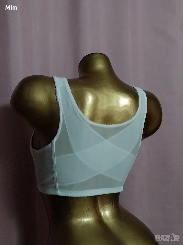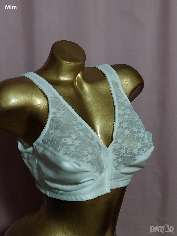 Бял сутиен/ бюстие / Чашката е мека без банели от плътен сатен и дантела с предно закопчаване с телени закопчалки, отзад с допълнителни ленти за поддържане на гърбът изправен ,подгръдна до 105 см еластичност .Нов без хартиен носител