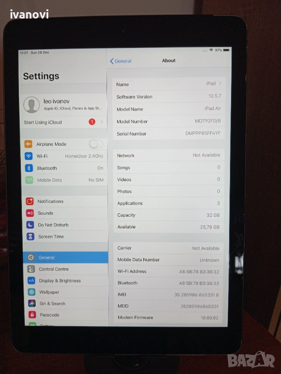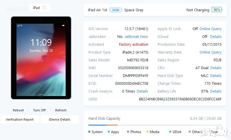 Донесен е от чужбина с НЕотписан iCloud профил и се наложи да се направи принудителна активация(Bypass). Не оказва влияние на функционалността но НЕ трябва да се прави UPDATE на IOS(то няма и смисъл, той е с последния IOS 12.5.7) или връщат заводски настройки (RESTORE) през компютър!