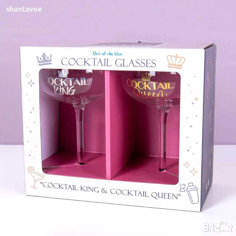 Върху едната чаша има златист надпис "Cocktail QUEEN" с корона, а върху другата чаша има сребрист надпис "Cocktail KING" отново с рисунка на корона.