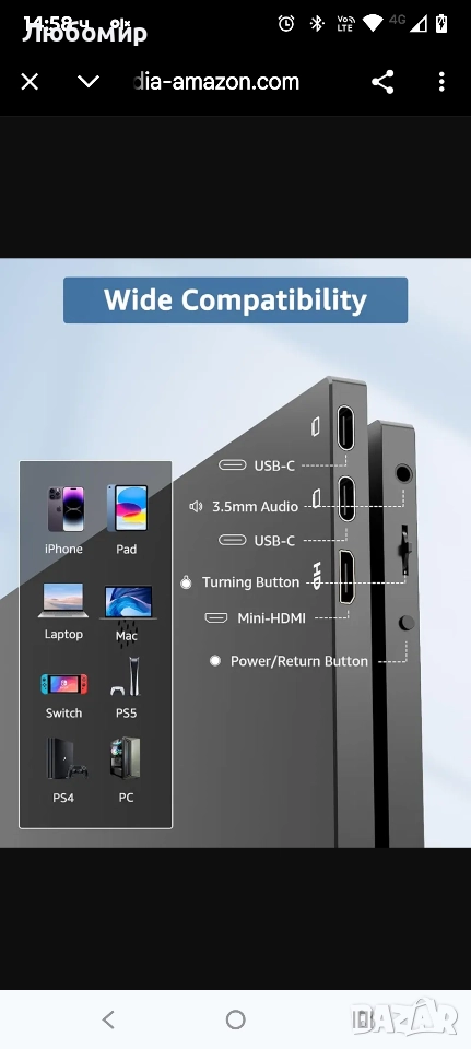 ⭐[Широка съвместимост] С два USB-C входни порта и mini HDMI входен порт, мониторът се свързва безупречно с широка гама от устройства, включително PC, Mac, лаптоп, телефони и геймърски устройства като Xbox, Switch, PS4/5.