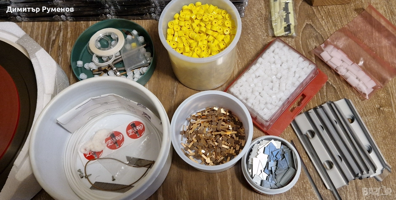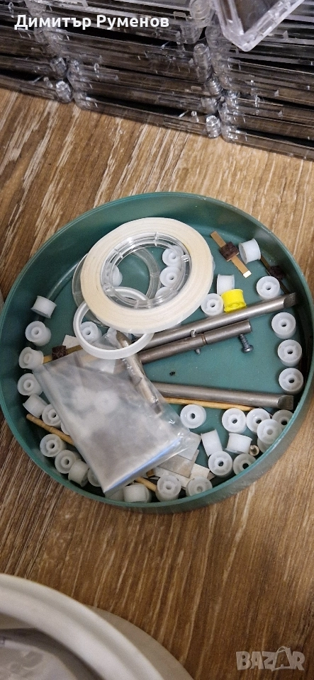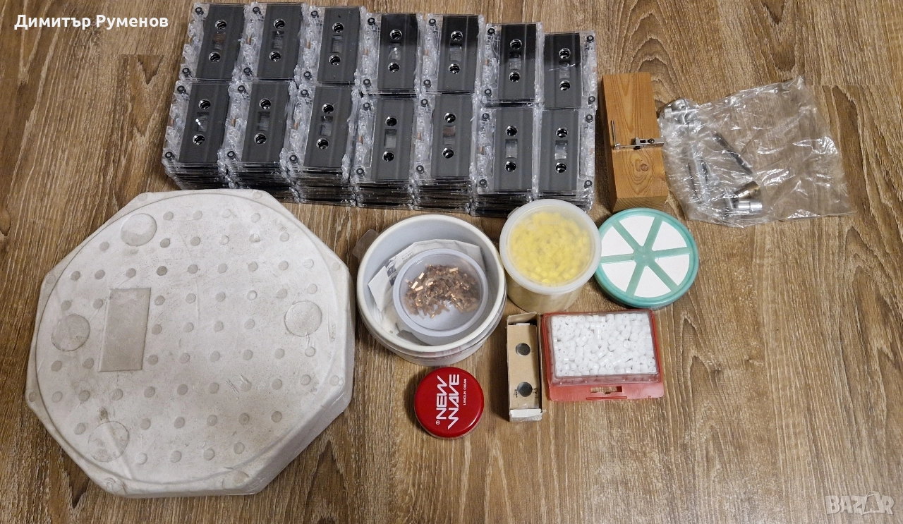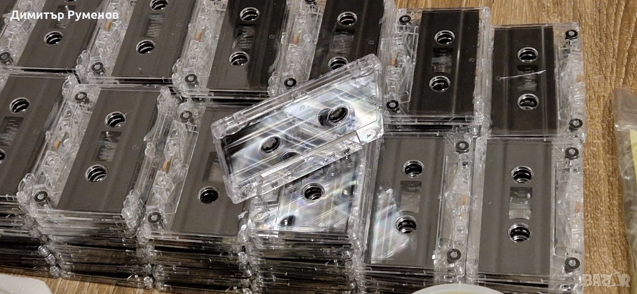 Пълен лот от аудио касети на части, останали от завода за информационни носители с. Драгор. Черупки 100бр без ленти само с ролки и водачи, ленти 2 ролки с дължина над 1000м, ролка само с водач и друго на снимките