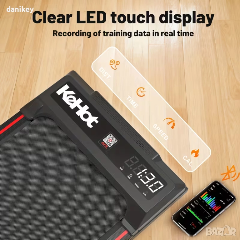 Пътеката е тънка, тиха и лесна за съхранение – прибира се под легло или диван. Управлява се с дистанционно и разполага с LED дисплей, показващ скорост, време, разстояние и изгорени калории. Може да се свързва с фитнес приложения, което позволява проследяване на тренировките и активността директно от телефона.