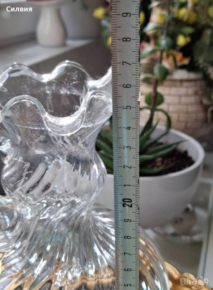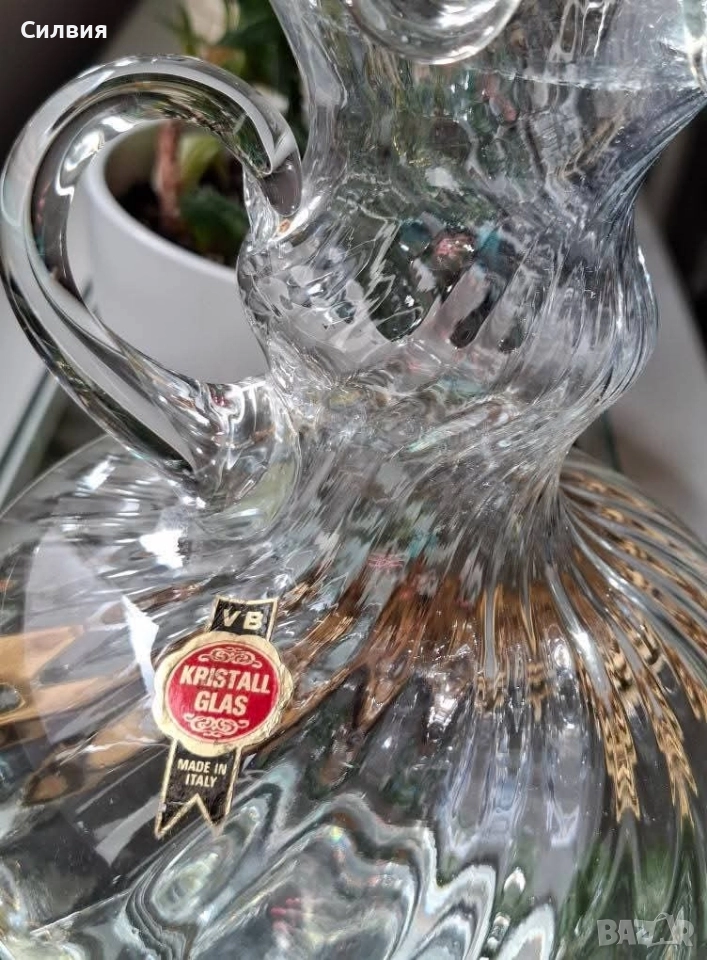 Кристална ваза с дръжка Тази винтидж ваза от кристално стъкло е с височина 25 см и се отличава с вълнообразен дизайн. Това е оригинално студийно произведение, в стил Арт Деко. Made in Italy. Вазата е едновременно декоративна и функционална, което я прави вечно допълнение към всяка колекция от домашни декори. Има минимални следи от употреба. Към дъното се забелязват малки петънца с цвят на ръжда. Както и в горната част към ръба има следа от използване на вода... Цена 3️⃣5️⃣лв. 17,89 € ೋ🌷 ೋ🌷 ೋ🌷