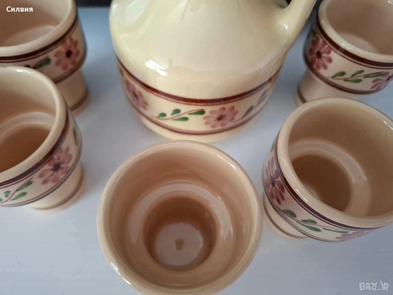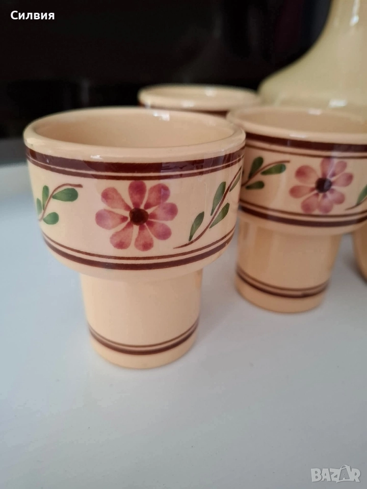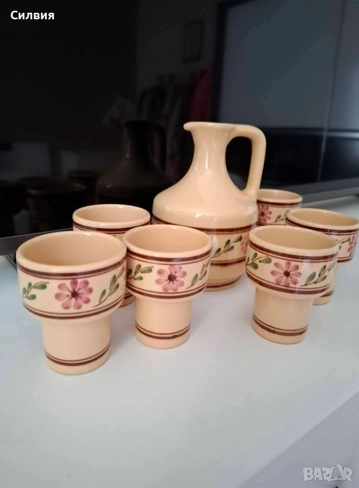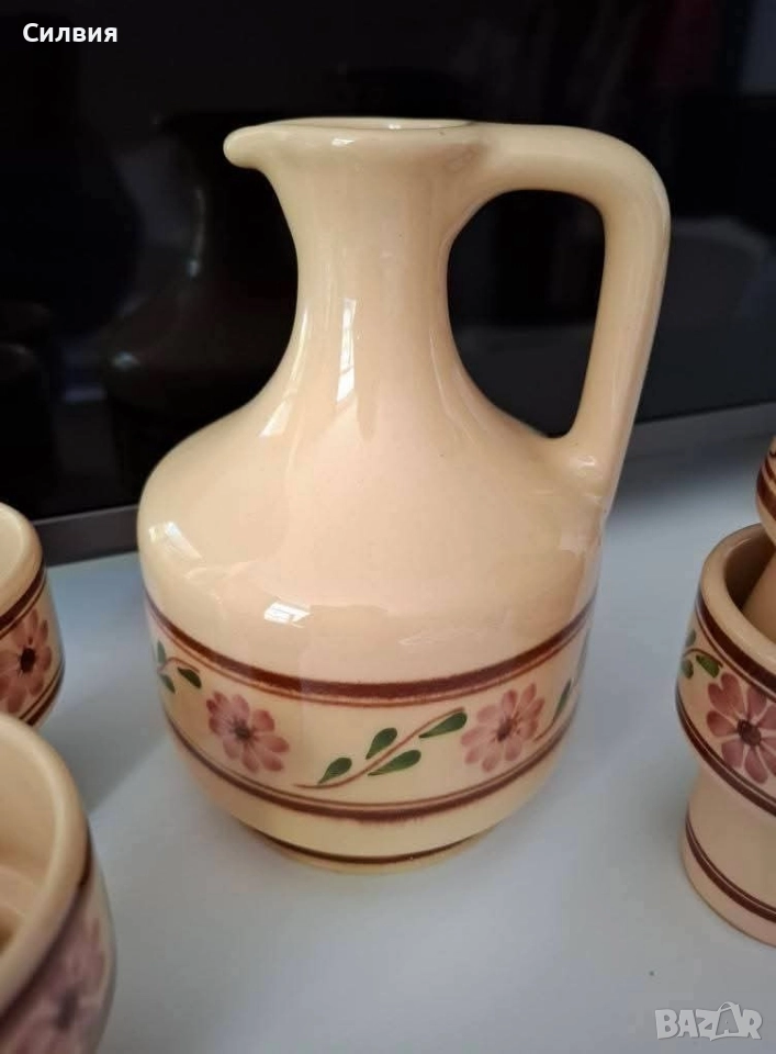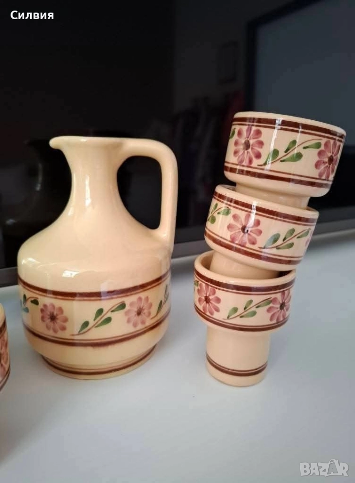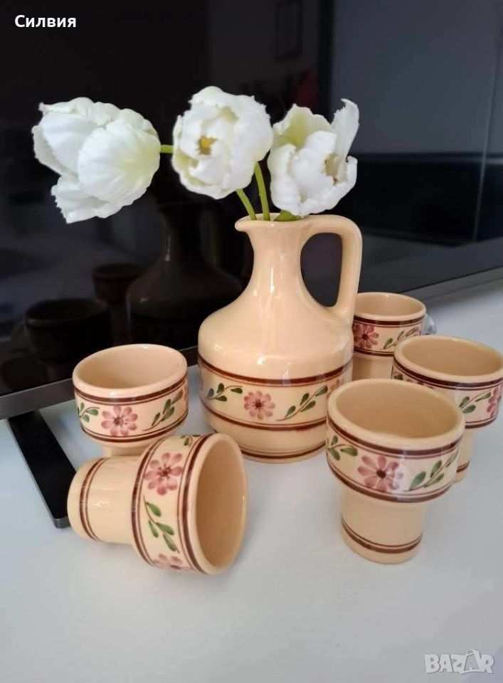 делва/графин и чашки, украсени с ръчно рисувани цветя в традиционен стил. Цветовете и мотивите напомнят везбените орнаменти от българската народна носия – с розови цветя и зелени листа, типични за фолклорното изкуство от Тракия и Средна България. Изработен от керамика, с глазура в топли тонове, сервизът е подходящ както за домашна употреба, така и като част от етно колекция или интериор в ретро или фолклорен стил. 🟠 Включва: ●1 Каничка, графин/делва с дръжка. Вместимост ~600мл. ●6 чашки с интересна форма. Вместимост около 100мл. 🇧🇬 Произведен в България – вероятно в гр. Троян или Ловеч, известни с традиционната си керамика. 🎁 Подходящ подарък за ценители на българския бит, традиции и ретро стил. Цена 5️⃣5️⃣лв.28,12 €